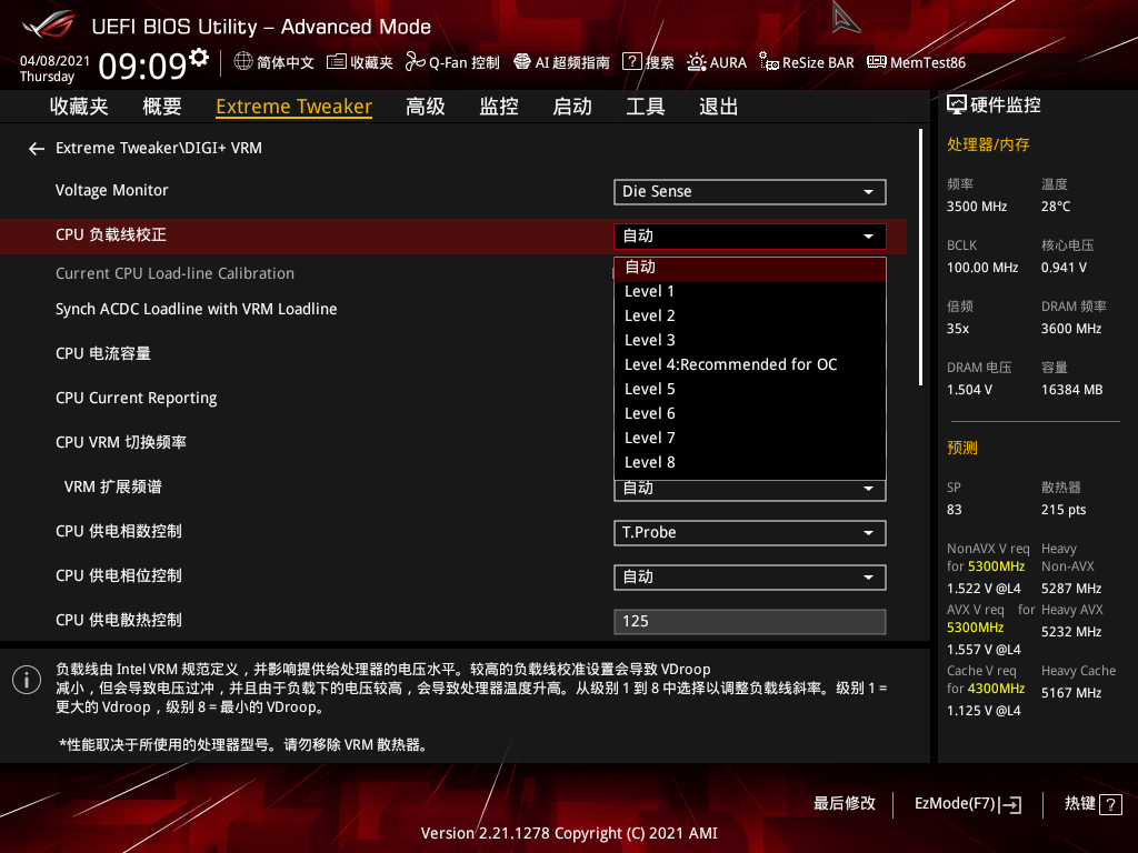 对于简单超频的玩家来说,除了设置倍频和电压这两个常规参数外,还可以打开ROG主板的防掉压设置,保证超频后拥有足够的稳定性,一般开到LV4级即可。