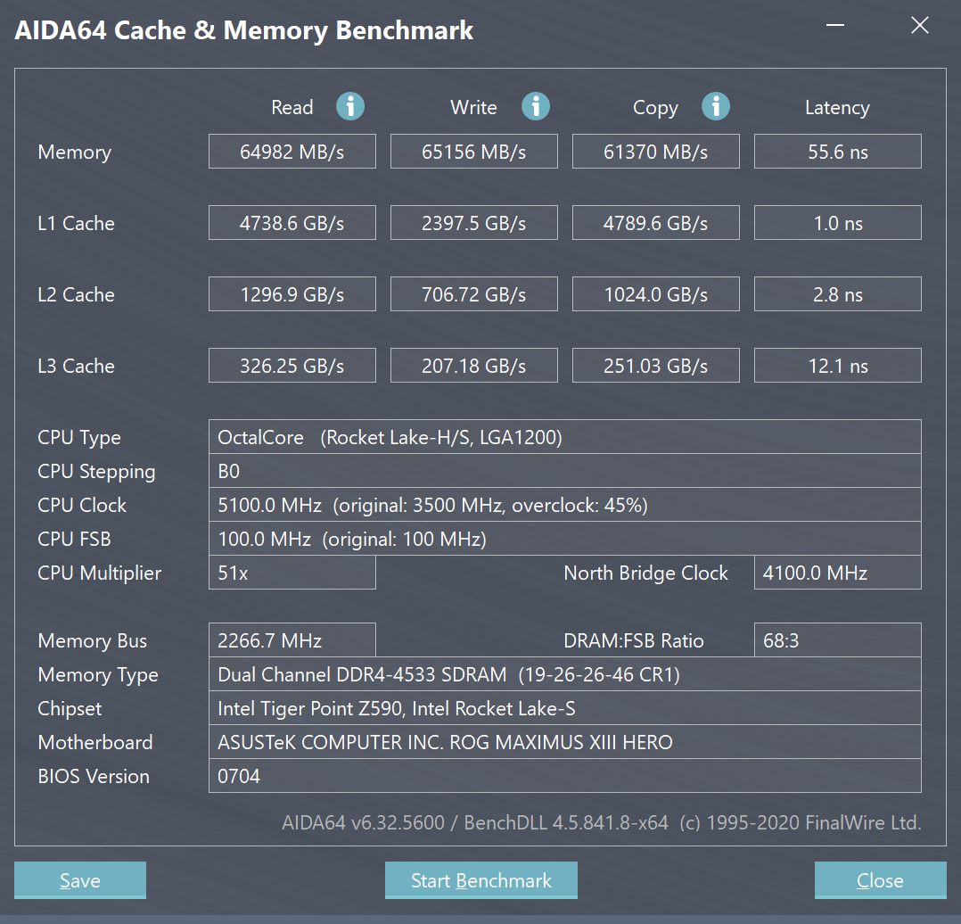 威刚XPG-D50龙耀系列DDR4 3600 8GB×2使用了采用海力士颗粒,在XMP下的默认时序为18-20-20-42@1.35V。经过简单的调试,我们将其超频至了4533MHz@19-26-26-46,AIDA64的读写测试成绩提升到了65000MB/s左右,延迟则为55.6ns。