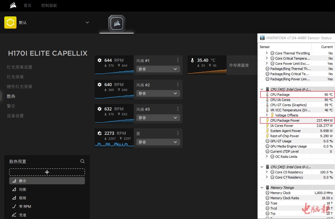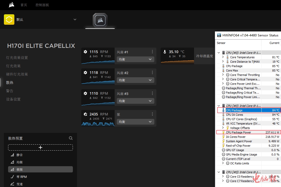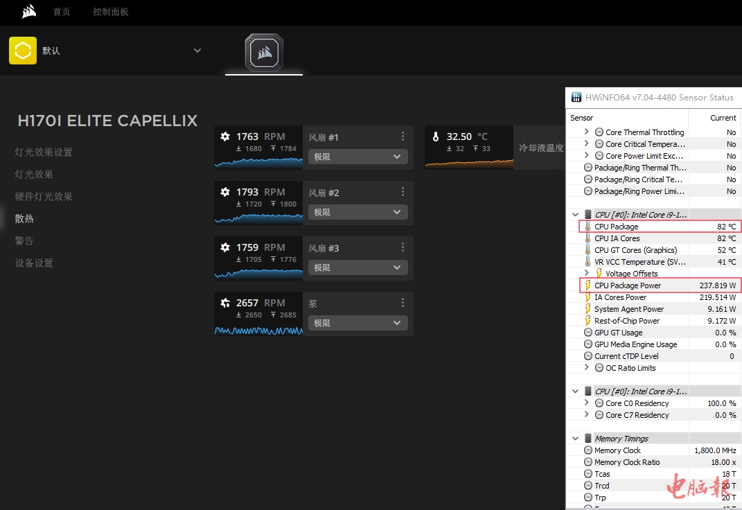 在美商海盗船自家的iCUE软件中,可以根据需要选择散热模式。首先,我们就来看看散热性能最强的极限模式。从图中可以看到,在极限模式下,水泵和风扇都达到了最高转速,考机半小时CPU封装温度为82℃,离温度墙还有18℃,冷却液温度为32.5℃(冷排摸起来只是微热),表现比较不错,要知道此时封装功耗已经达到了237W,一般的水冷散热器根本HOLD不住。此外,在极限模式下虽然三个ML140 RGB风扇都达到了1700rpm以上的转速,但噪声也还在可接受范围内,开放平台下也只会听到轻微的风声。