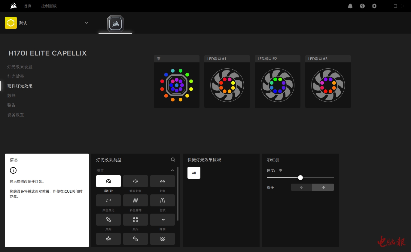 除了散热性能出色之外,H170i的灯效也是精英系列的特色,冷头和风扇里都配备了多个可单独寻址的RGB LED,通过iCUE可以自由设定灯效模式。当然,也可以选择硬件灯效模式,将灯效保存在冷头的存储空间中,这样就算不启用iCUE软件,冷头和风扇也可以按照预设的灯效进行显示。