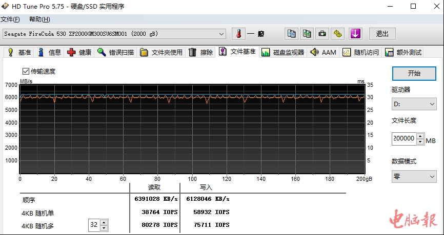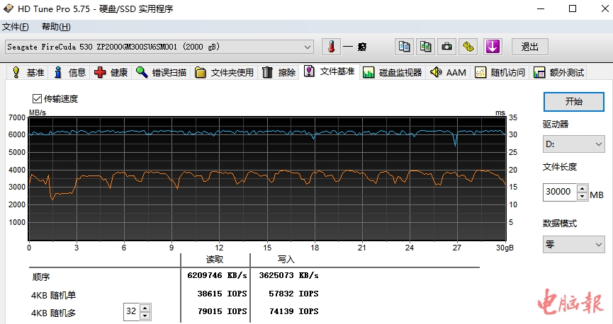 可能有人会疑惑,空盘情况下,SSD能保证200GB不掉速,如果SSD已经写入大量的资料,还能维持稳定的速度吗?在这里编辑传输了1833GB(可用空间为1864GB)大小的文件到希捷酷玩530,然后设置30GB文件长度,再次进行了测试。