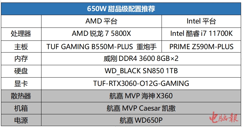 目前全新装机的话,选择Intel酷睿i7 11700K或者AMD锐龙7 5800X的处理器搭配RTX 3060显卡是比较主流的高性价比组合,而这样的配置搭配650W电源是非常合适的。航嘉WD650P正是为了满足这类甜品组合而设计,从规格来看,它的额定输出功率为650W,其中+12V最大输出功率为600W、最大输出电流50A,可以轻松满足主流性能级处理器和显卡的供电需求。
