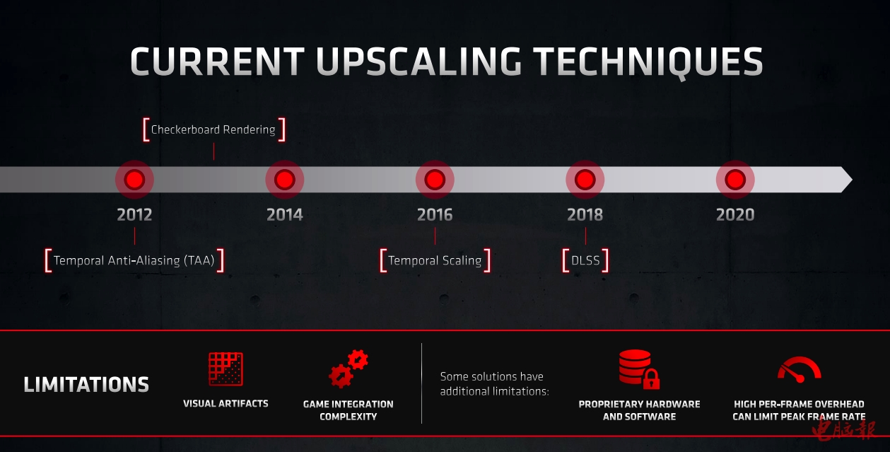 通过特定的算法,在提升游戏帧率的同时尽量保证游戏画面质量的技术可以追溯到多年以前,例如早在2012年就出现的TAA时间抗锯齿,2016年出现的时间缩放以及2018年出现的NVIDIA第一代DLSS深度学习超级采样技术。不过,这些早期的技术存在多项缺陷,要么是画质不尽如人意、游戏提供支持比较麻烦,要么是需要特定硬件支持、过高的帧负载限制了游戏的峰值帧率。此外,由于光线追踪在游戏大作中越来越流行,开启光追又会导致游戏帧率大幅降低从而影响流畅度,这就需要新的技术来解决这个问题,AMD FSR应运而生。