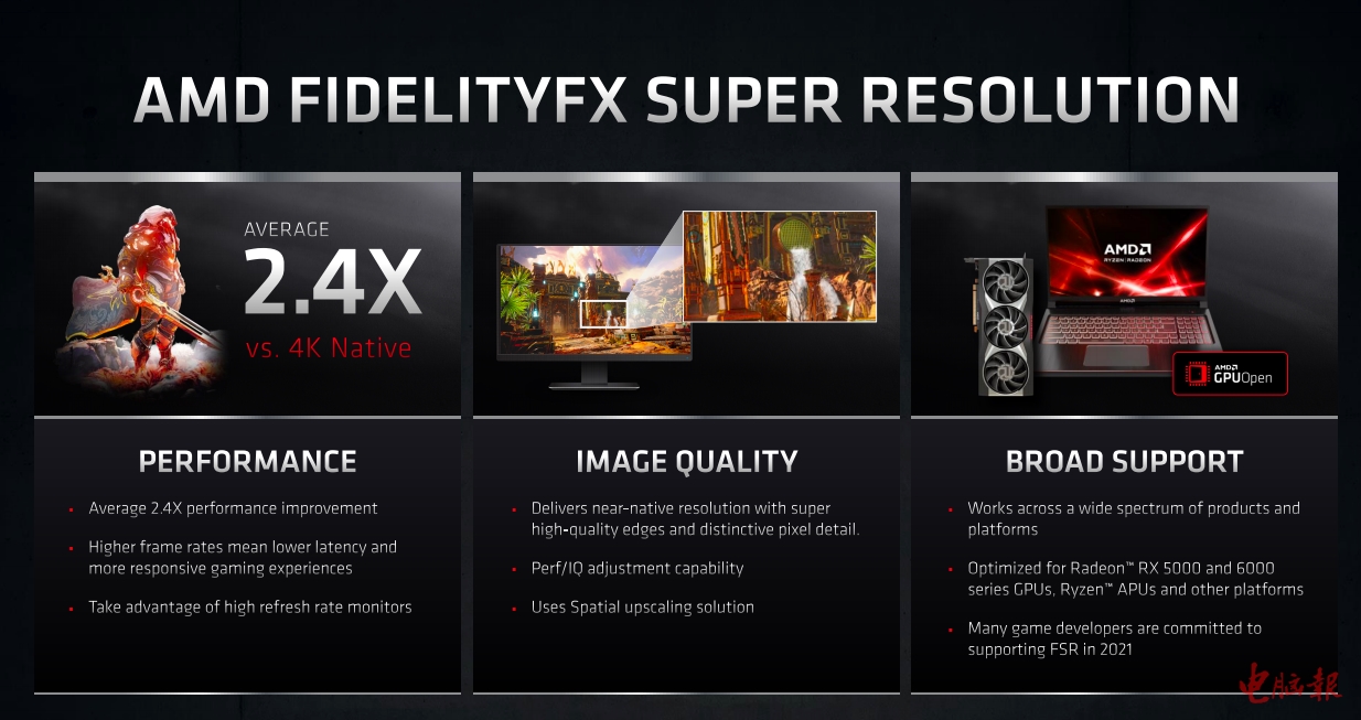 从AMD提供的官方数据来看,在4K分辨率下,开启FSR游戏帧率平均可提升到原来的2.4倍,更高的帧率带来了更低的帧延迟和更快的操作响应速度,配合高刷新率可获得更高的流畅度。在大幅提升帧率的同时,采用空间算法的FSR依然能提供非常接近原生分辨率的物体边缘平滑度与像素细节,同时玩家也可以根据自己的喜好和实际情况在画面与帧率之间进行多档调节。硬件兼容性方面,FSR也非常友好,除了自家的GPU和APU(包括移动平台)之外,甚至还能支持NVIDIA的主流显卡,包括GTX 1060这样的普及型号。最后,很重要的一点就是游戏开发商要在游戏中添加对FSR的支持是很容易的,毕竟FSR是一项非常开放的技术。说到这一点,AMD秉承开放理念的FreeSync成功地逼出了开放的G-sync Compatible,那么这次FSR能不能再次打破对手的独占策略呢?我们对此十分期待。