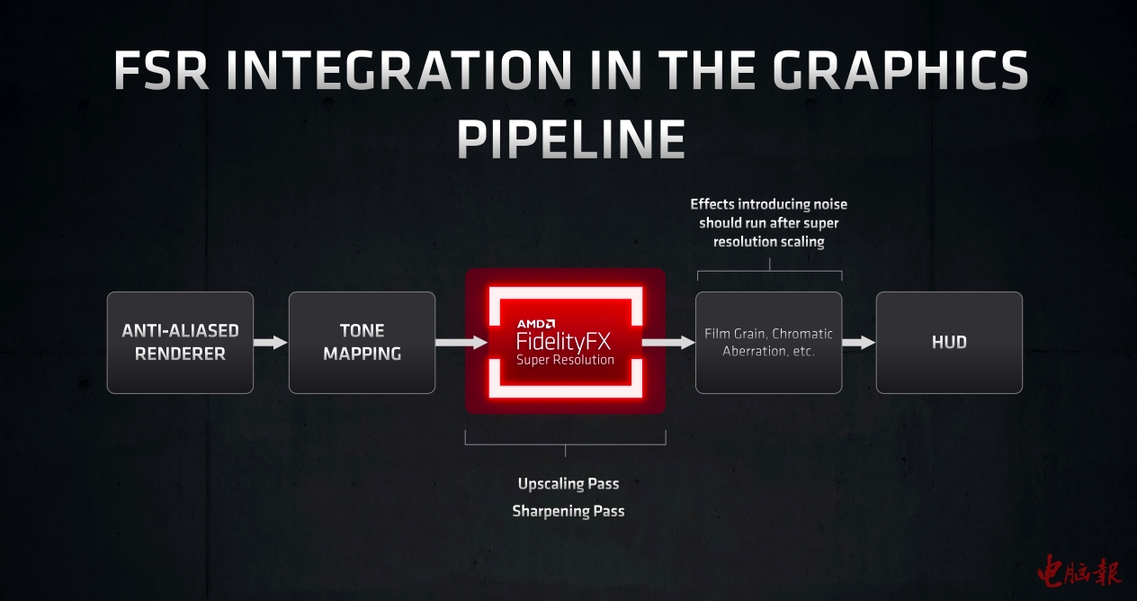 那么FSR是怎么工作的呢?从4K分辨率下的《银河撕裂者》示例我们可以看到,首先是通过降低分辨率渲染(FSR质量模式使用2K渲染)的方式提升游戏帧率,然后再通过FSR的高级边缘重建算法重建4K分辨率的源画面,同时锐化技术也可以大幅增强材质细节。另一张架构图也展示了FSR在游戏画面处理流水线中的位置是位于色调处理与后期特效处理之间。