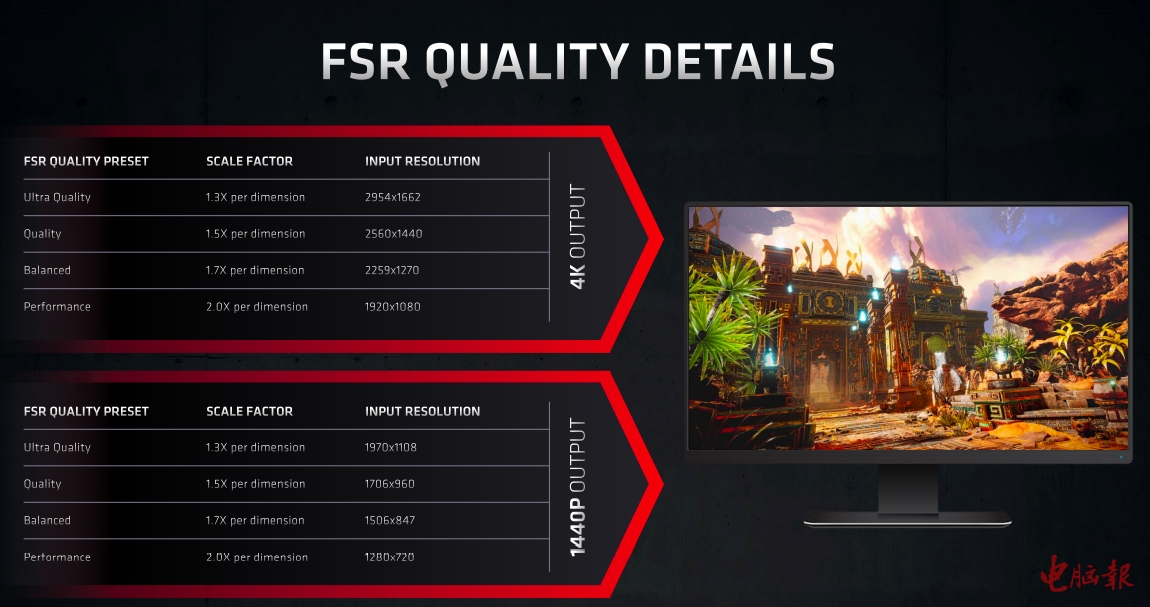 AMD在今年6月1日的COMPUTEX发布会上正式宣布了AMD FidelityFX Super Resolution(以下简称FSR)技术,通过此项技术可以让游戏帧率得到大幅的提升。从官方提供的数据来看,Radeon RX 6800 XT在4K分辨率极致画质设置下,《众神陨落》的帧率最多可提升近150%,效果非常惊人。显然,AMD此项技术针对的是NVIDIA的DLSS,而且目前已经有部分游戏提供了对FSR的支持,接下来也会有更多的游戏大作将添加对FSR的支持。那么,AMD的FSR到底是通过什么原理实现提升游戏帧率的?它的实战效果如何?对画质的影响是否明显?相信看完我们的深度评测文章,你就能得到答案。