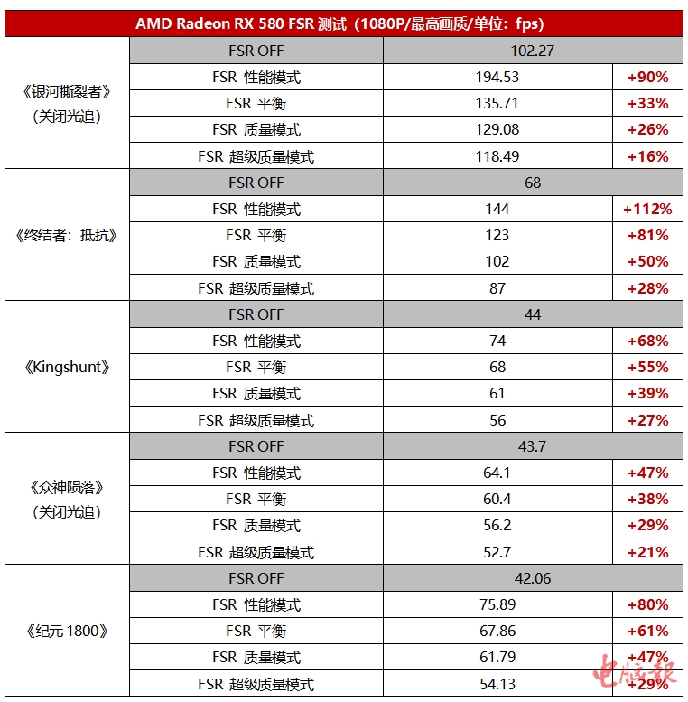 AMD Radeon RX 580是一块非常经典的1080P甜品游戏显卡,在玩家中的保有量也很高,不过毕竟它已经上市4年了,现在面对一些最新的游戏大作已经显得有些力不从心。那么,开启FSR之后,它能否获得新生呢?从测试结果来看,1080P分辨率下,开启FSR可以让AMD Radeon RX 580的游戏帧率最高提升118%之多!而且我们还看到,AMD Radeon RX 580原本已经无法让《众神陨落》《Kingshunt》《纪元1800》这样的大作在1080P极致画质下保持60fps的流畅帧率,平均帧率只有40fps出头,而开启FSR的性能模式之后,帧率普遍涨至60fps以上或是70fps以上,就算选择 FSR平衡模式或质量模式,平均帧率也能达到60fps的流畅水准。