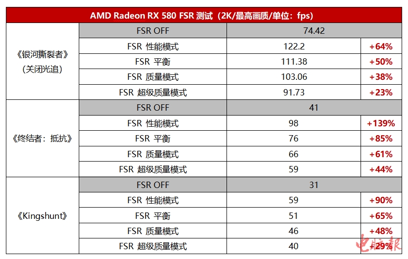 从测试来看,FSR真的做到了这一点。除了《银河撕裂者》这样帧率本来就比较高的游戏,像《终结者:抵抗》《Kingshunt》本来AMD Radeon RX 580都只能跑出30fps~40fps的水平,在开启FSR性能模式之后帧率分别提升到了98fps和59fps,流畅度可以说已经达标了。而且《终结者:抵抗》即便是开FSR超级质量模式兼顾画质,帧率也可以接近60fps,确实相当于把这款1080P老显卡升级到2K级别了。