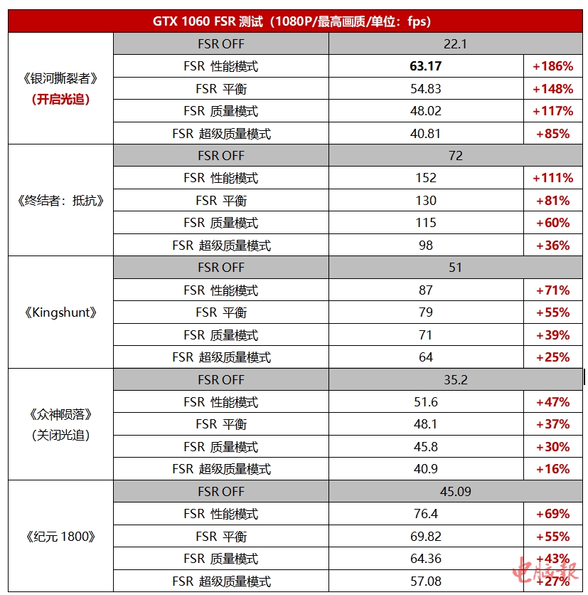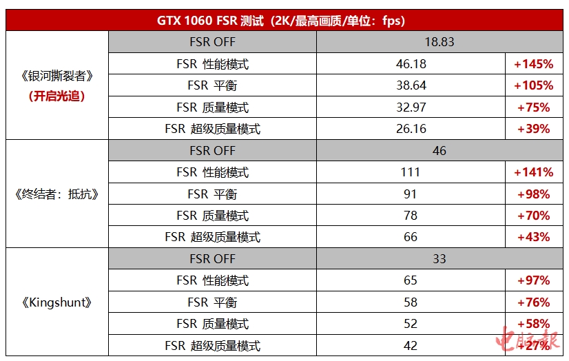GTX 1060也是一款保有量很大的1080P甜品游戏显卡,上市也有5年了,不过自从NVIDIA开始猛推RTX系列之后,硬件级光追和DLSS这样的技术就不可能再下放给这位老前辈使用了,因此就算GTX 1060能通过软件加速的方式运行光追游戏,帧率也是幻灯片级的。然而AMD FSR出现之后情况变得很有意思。可以看到,在开启FSR性能模式之后,1080P分辨率下开启光追的《银河撕裂者》游戏帧率从22.1fps暴涨至63.17fps,立马就从幻灯片变得流畅可玩了。此外,其他非光追游戏中,1080P分辨率下的帧率也有27%~148%的提升,2K分辨率下游戏帧率有27%~145%的提升,效果非常明显。大家都没想到,被NVIDIA最新技术抛弃的老显卡,现在AMD一个免费技术就让它可以在60fps下运行光追游戏了,业界良心啊。