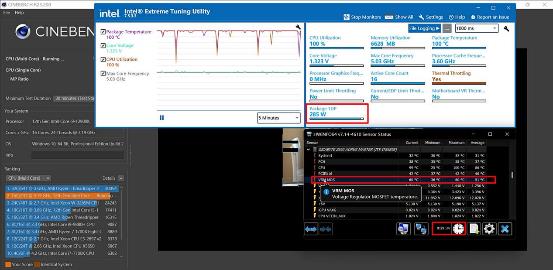 全核5GHz考机功耗大约为285 W,考机半小时后VRM MOS温度最高60℃