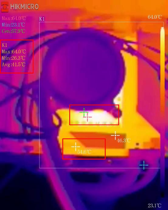 热像仪监测画面可以看到VRM区域最高温度仅为64℃,散热片最高温度54.6℃