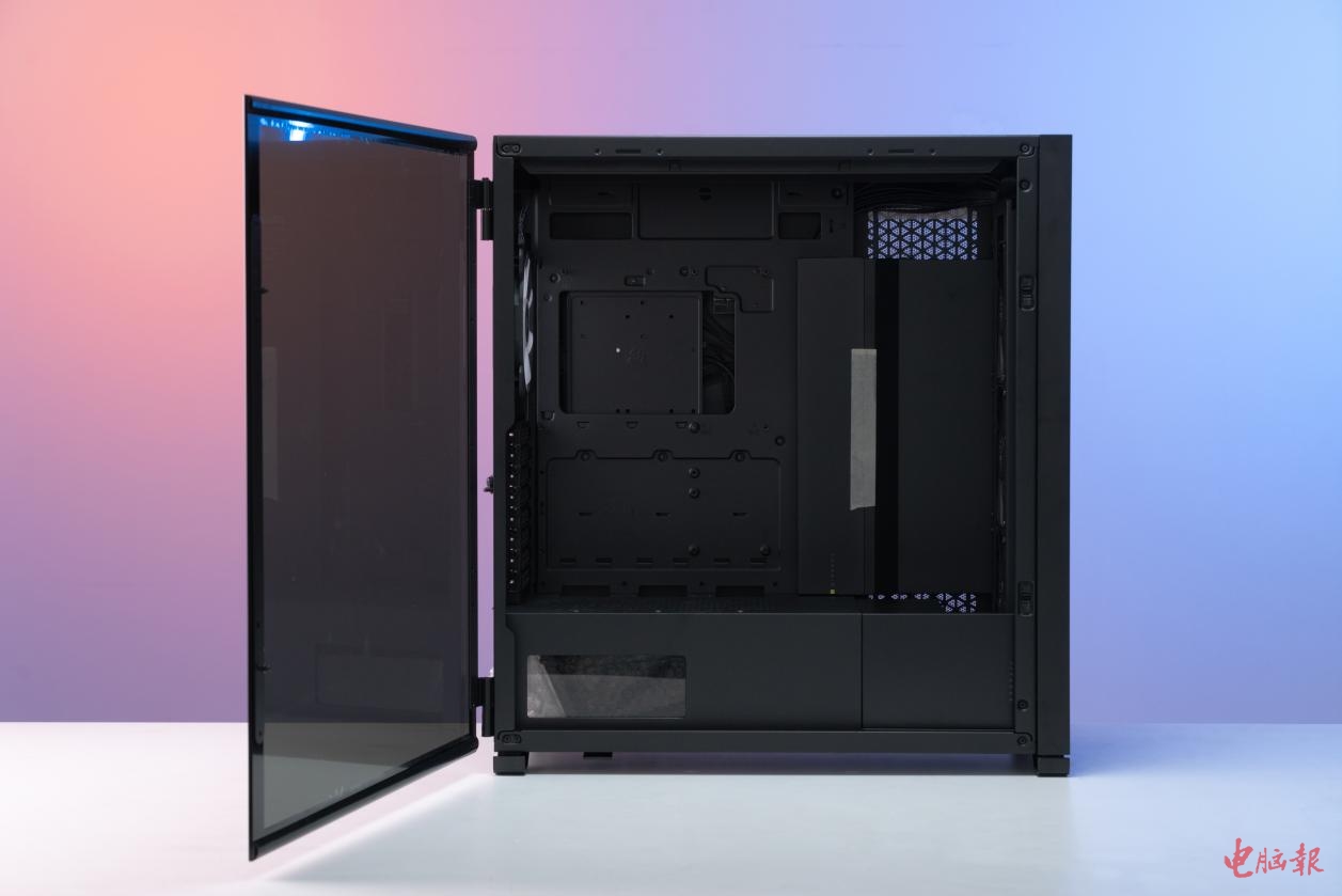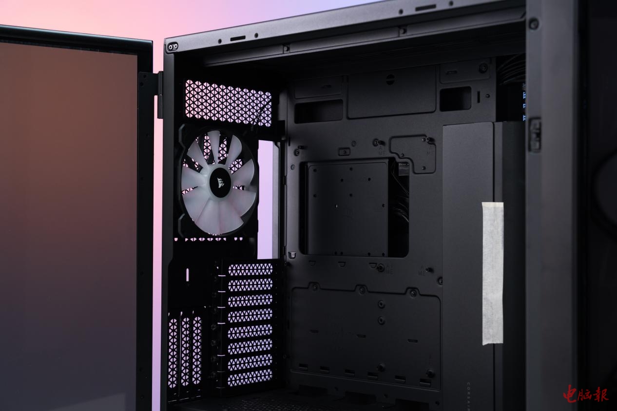 机箱的两个侧面板均采用了铰链式设计,牢固且易用,安装硬件时只需轻轻一拉就能打开侧面板,非常的方便。同时机箱前部和顶部的钢化玻璃面板都可以进行拆装,便于对机箱内部进行清洁维护或改造。考虑到高端电源的线材会更为粗壮,所以iCUE 7000X RGB在背面设置了30mm深的理线槽配以带魔术贴、电缆护盖等配置的RapadRoute理线系统,走背线更轻松,又能保持机箱内部的整洁。