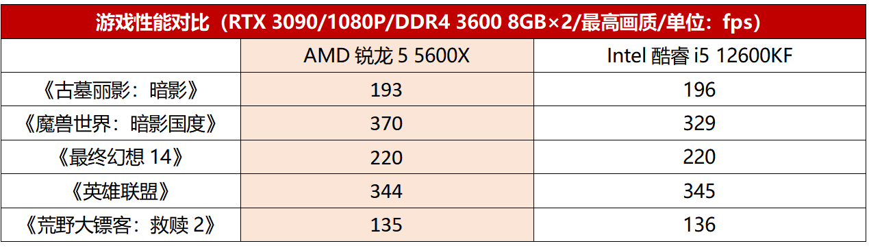 接下来看看在运行游戏时,酷睿i5 12600KF和锐龙5 5600X的表现有何区别吧。