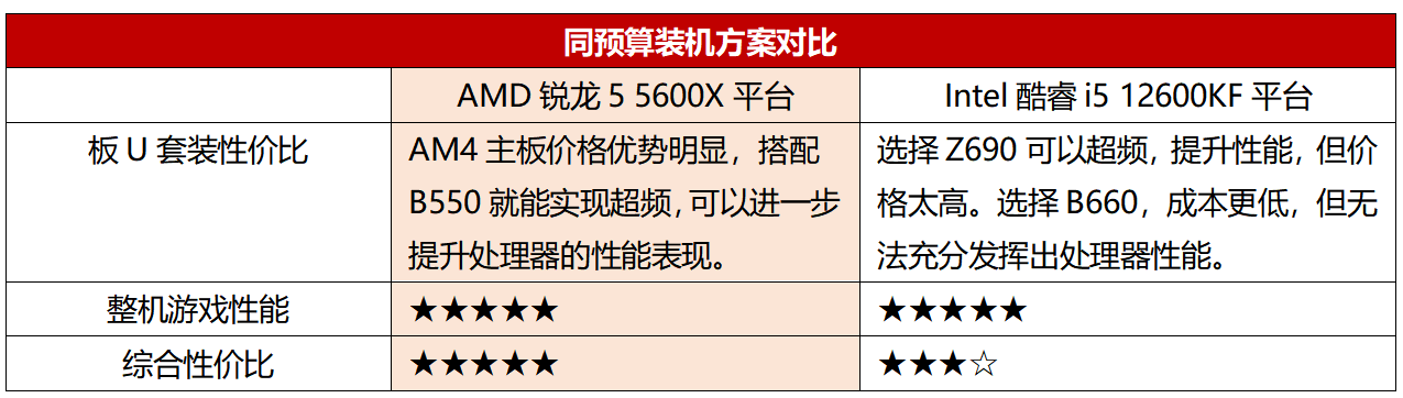 在装机时,要想完全发挥出酷睿i5 12600KF的性能,只能选择价格高昂的Z690主板,这下成本可就高了。如果选择B660,成本更低可处理器性能再无可挖掘空间。而选择锐龙5 5600X就没有这个顾虑,搭配B550就能实现超频,保证处理器性能的充分发挥。因此综合来看,打造中端游戏主机选择锐龙5 5600X性价比优势太明显,依然是当下的首选。