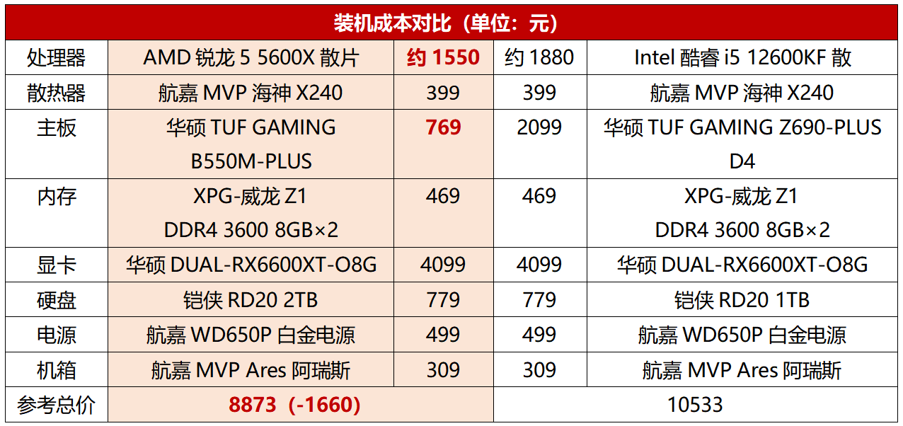 可以看到在其他硬件都是相同型号的情况下,光是处理器和主板两项,两套配置之间就拉开了1660元,这差距可不小。要是将省下的预算放到显卡上,完全能将显卡从RX 6600 XT升级到RX 6700 XT,如此一来两套配置之间的游戏性能差距可就大了。