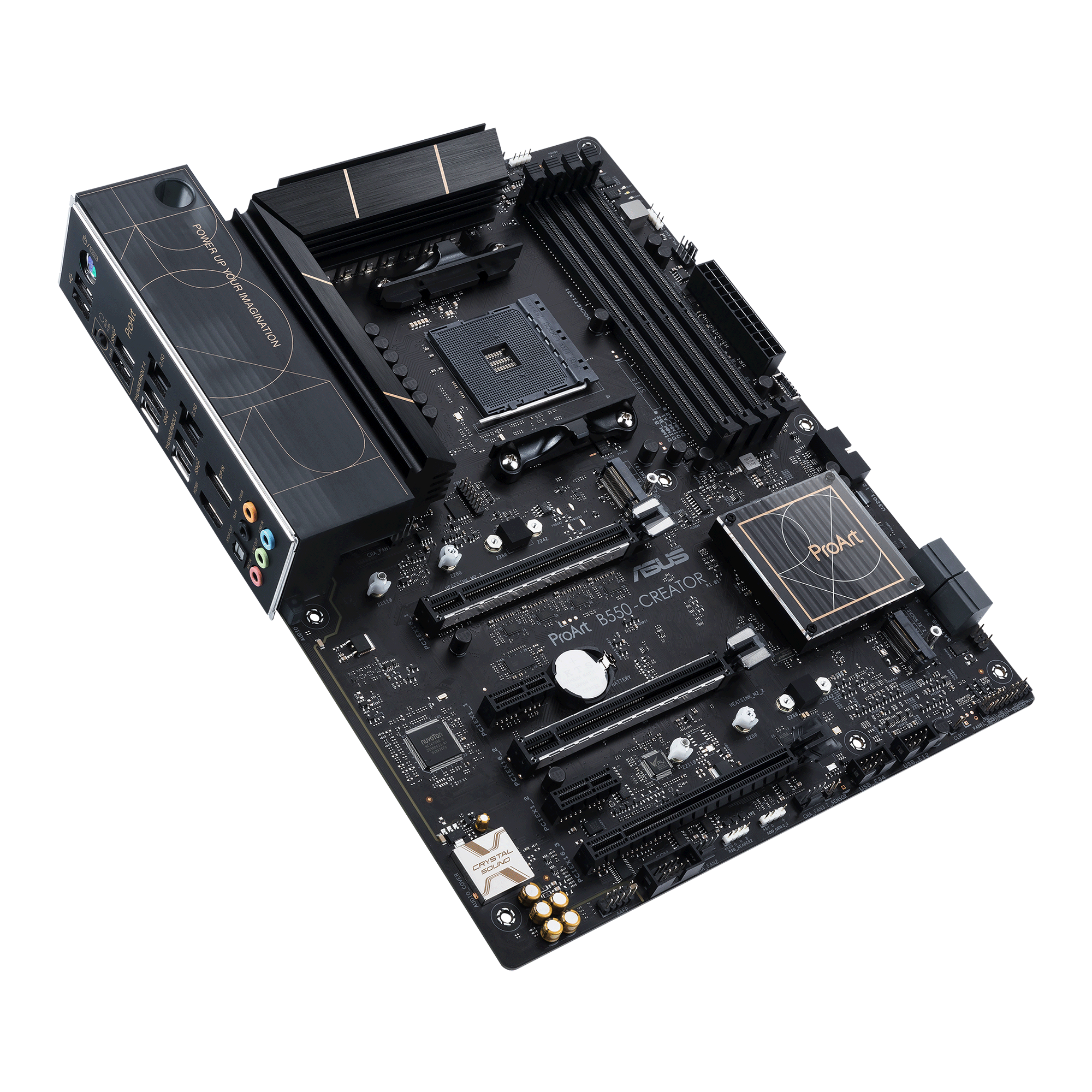ProArt B550 Creator主板整体采用黑色设计,并在散热片上点缀有金色线条。由直线和弧线勾勒出的极简线条,细看可以发现其组成了“PROART”字样,设计美感十足。另外VRM散热区的装甲上采用了半透明磨砂材质外壳,南桥芯片组上方则采用了透明亚克力外壳,设计细节值得好评。