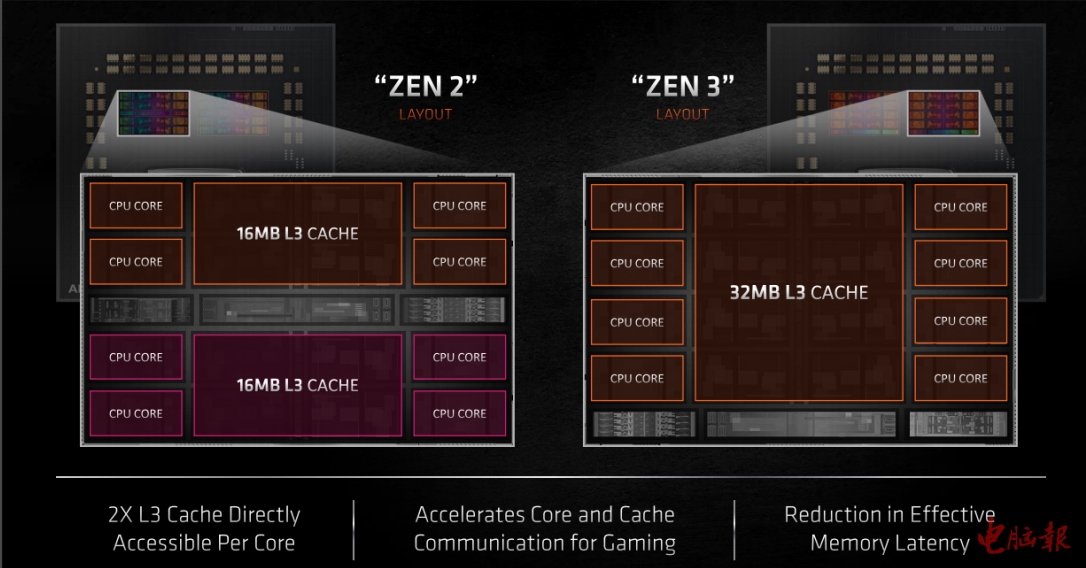 锐龙5000的ZEN3架构大幅提升了IPC,同时单CCX结构也可以8核心共享32MB大缓存
