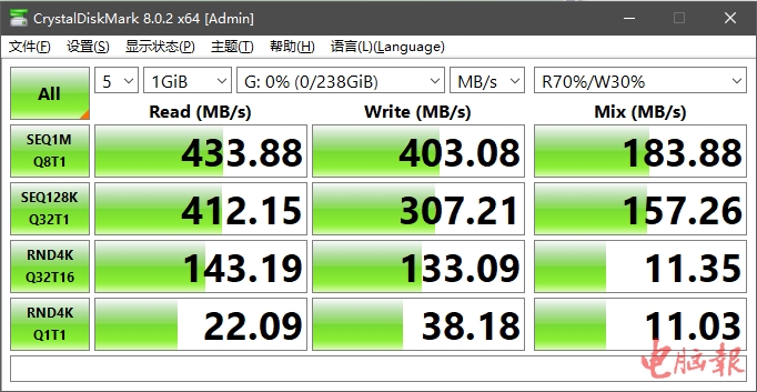 性能方面,台电飞豹固态U盘十分强悍,在CrystalDiskMark软件测试中的成绩甚至超过了官方数据,顺序读取速度433.88MB/s,写入速度403.08MB/s,70%读取/30%写入混合测试成绩为183.88MB/s,是普通机械硬盘速度的两倍以上。