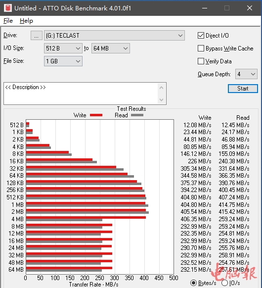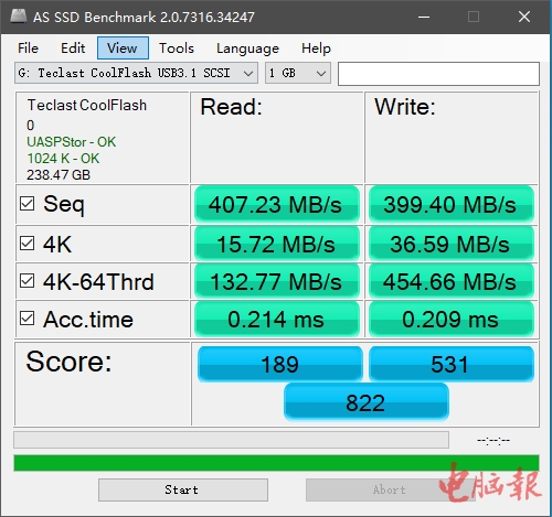 换一个跑分软件测试,成绩依旧出色,AS SSD Benchmark软件测试中,持续读写读取速度407.23MB/s,写入速度为399.40MB/s。而在ATTO Disk Benchmark测试中,也可以看出这款U盘侧重于中小文件读写以及大文件写入性能,纸面成绩接近SATA SSD,完全满足高性能数据传输需求。