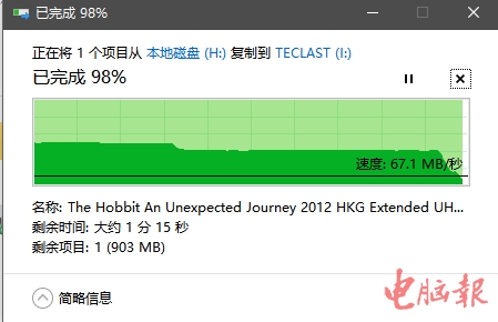 不仅如此,台电飞豹固态U盘的实际使用传输速度也很快,得益于优秀的写入性能,从电脑复制文档、照片一类的小文件到U盘几乎是瞬间完成。这里我们以71GB的超大视频文件为例,文件写入一共耗时4分40秒(280秒),速度保持在260MB/s以上,直到68GB左右才开始明显掉速,平均写入速度250MB/s。读取的情况和写入类似,前期的传输速度很稳定,平均读取速度270MB/s。