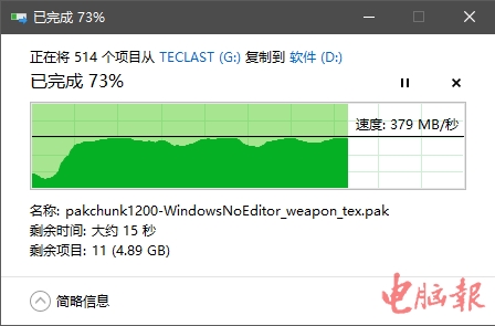 然后是小文件较多的游戏文件,写入18.2GB大小的游戏文件耗时1分11秒(71秒),全程几乎没有掉速,平均写入速度260MB/s;读取的速度更快,不到一分钟便传输完成,平均读取速度330MB/s。小文件的读写性能均好于大文件,这也与上面的软件测试成绩相符合。