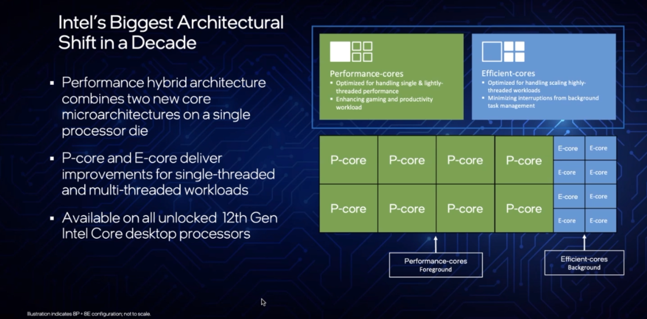 全新性能混合架构(性能核+能效核)称得上是第12代酷睿最具代表性的升级亮点