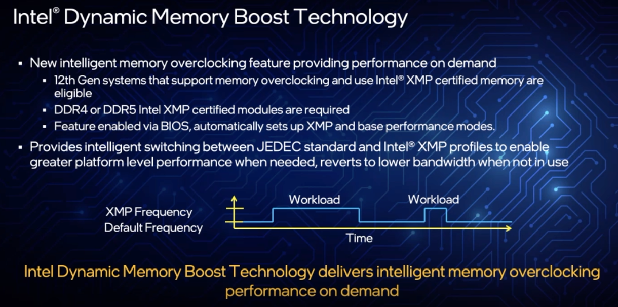 特别值得一提的是,这次第12代酷睿还为DDR5内存提供了XMP 3.0标准,内存SPD中增加了两个可供玩家覆写的配置文档,并支持动态频率加速技术,低载下保持JEDEC默认频率,高载下加速到XMP频率,超频控制更加灵活。
