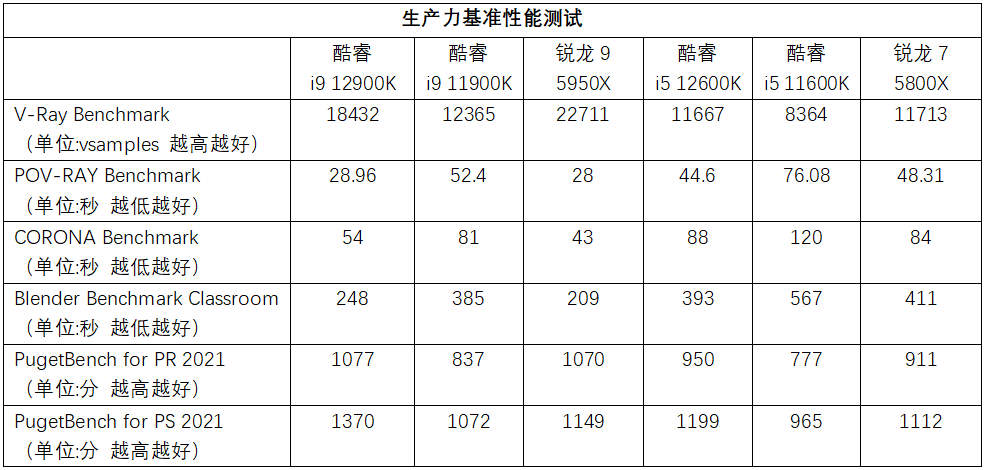 本次送测的Intel第12代酷睿处理器为旗舰的酷睿i9 12900K和主流级的酷睿i51 12600K,上一代的对比产品选用了酷睿i9 11900K和酷睿i5 11600K,竞品方面则是选择了AMD旗舰级的锐龙9 5950X和中端产品锐龙7 5800X。接下来就开始正式的测评吧。