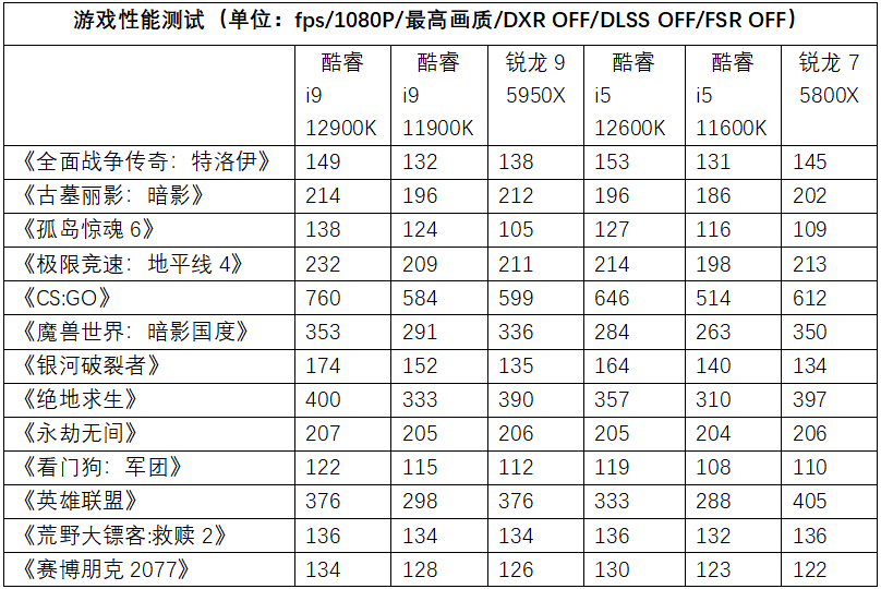 《极限竞速:地平线4》中,酷睿i9 12900K同样表现最佳,酷睿i9 11900K/酷睿i5 12600K/5950X和5800X的表现则比较接近,比12900K的帧速低了10%左右。
