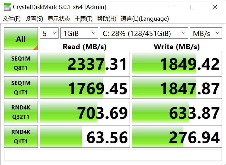 SSD性能方面,我们使用CrystalDiskMark进行测试,实测连续读取为2337.31MB/s,连续写入为1849.42MB/s,达到目前中端PCIe3.0 NVMe SSD的水准,流畅使用没有问题。由于英睿达P2是一款采用群联主控+TLC颗粒的M.2 SSD,玩家们也无需太担心其寿命问题。