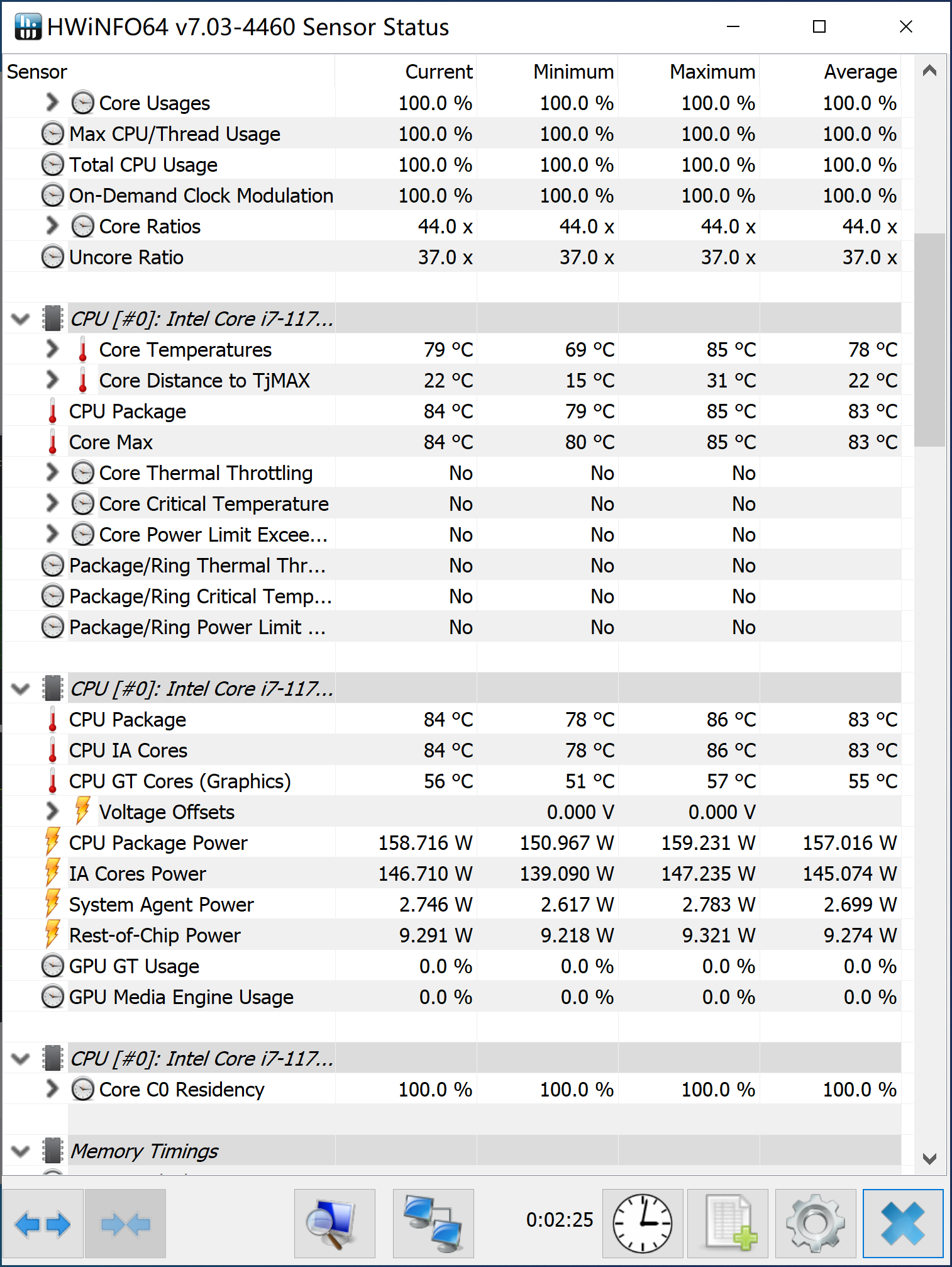温度与散热方面,在室温27℃的办公室环境中,使用AIDA64 FPU连续考机30分钟,在关闭AVX512的情况下,处理器温度保持在79℃左右,HWINFO显示的功耗为158W,此时处理器全核心频率为4.4GHz。在开启AVX512时,处理器温度为83℃,HWINFO显示的功耗为165W,此时处理器全核心频率为4.1GHz,水冷散热的表现没有问题。