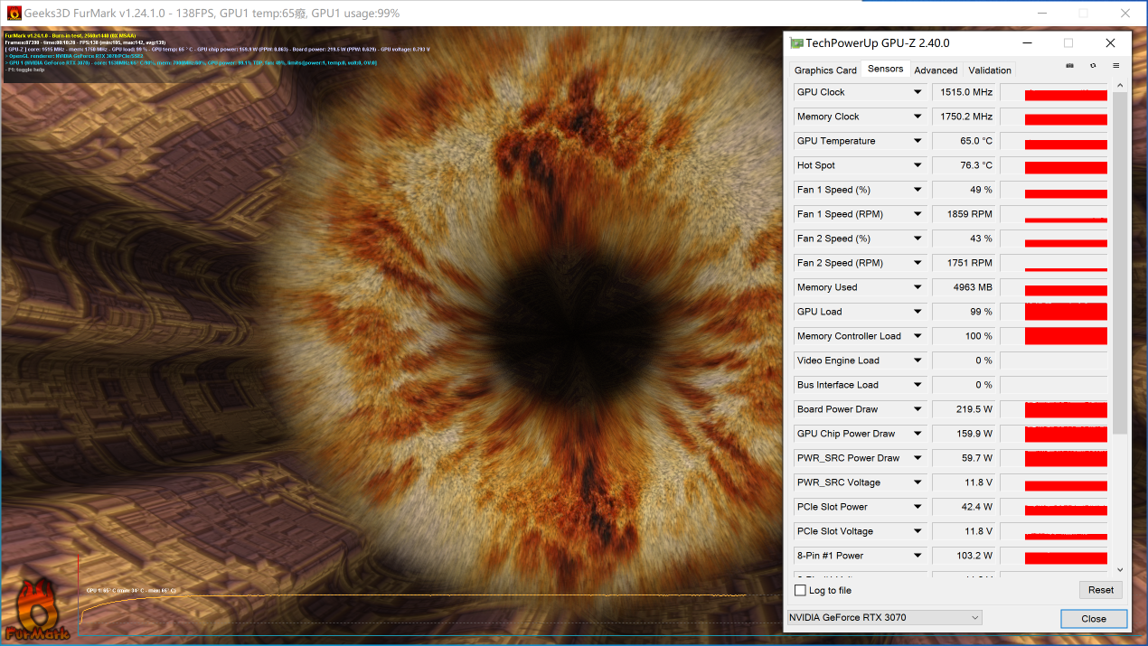 在同样的环境中,使用FurMark对显卡进行连续半小时的考机,显卡温度维持在65℃左右,玩家无需担心炎炎夏日中的显卡温度问题。