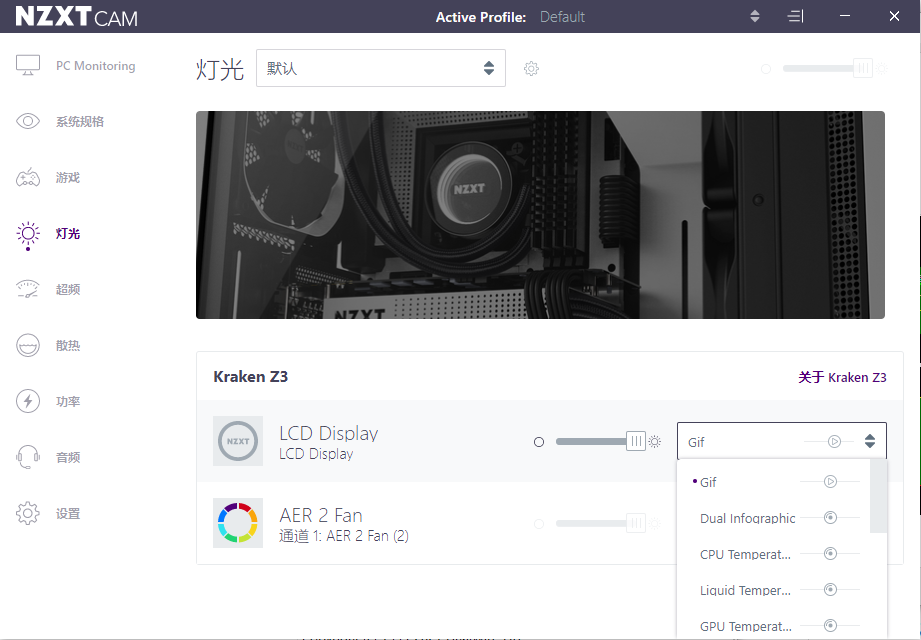 通过NZXT CAM控制软件,能很方便直观地了解系统温度、频率等数据的同时也能对散热器转速方案以及灯效进行调节。在灯光选项调节中,可以单独调节自定义LCD显示屏和风扇RGB灯光效果,其中RGB风扇拥有多达25种的预设灯光模式,而自定义LCD显示屏除了系统信息显示之外就是我们上面提到的GIF动画了。支持最大20MB的GIF上传,用户可以根据自己的喜好,配合其他硬件打造独一无二的个性化视觉效果。
