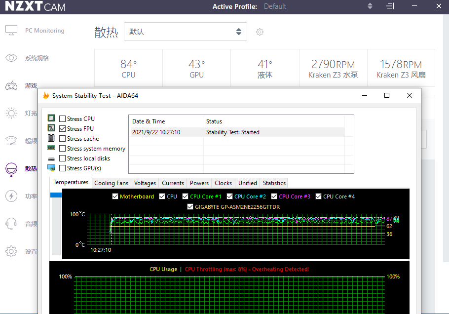 性能实测方面,我们选择Intel i9 11900K来测试NZXT Kraken Z53 RGB的散热性能,测试室温为26℃。首先在静音模式下进行AIDA 64 FPU负载测试,此时的水泵转速在2300RPM左右,风扇还不到1200RPM,虽然静音效果确实不错,但CPU温度已经来到了92℃。接着我们又将水泵和风扇的转速手动调至最大,在连续考机20分钟的情况下,软件显示的处理器温度为84℃,CPU功率稳定在226.4W,处理器Package温度也只有89℃,表现比较不错。同时转速全开下的噪声控制也是很优秀的,20cm外就听不到明显的风噪了。