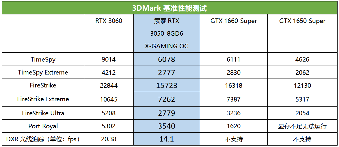 从基准测试软件《3DMark》的测试成绩来看,和RTX 3060相比,因为两者之间的定位差距太大,自然性能上也有较大的差距,这完全是在我们的预料当中的。索泰RTX 3050-8GD6 X-GAMING OC在各个项目中获得的分数都大幅领先于GTX 1650 Super。个人觉得比较值得关注的是,GTX 1660 Super除了在光线追踪的测试项目PORT ROYAL和DXR光线追踪吃亏比较明显之外,在其他的各个项目中,分数都是要略高于索泰RTX 3050-8GD6 X-GAMING OC。