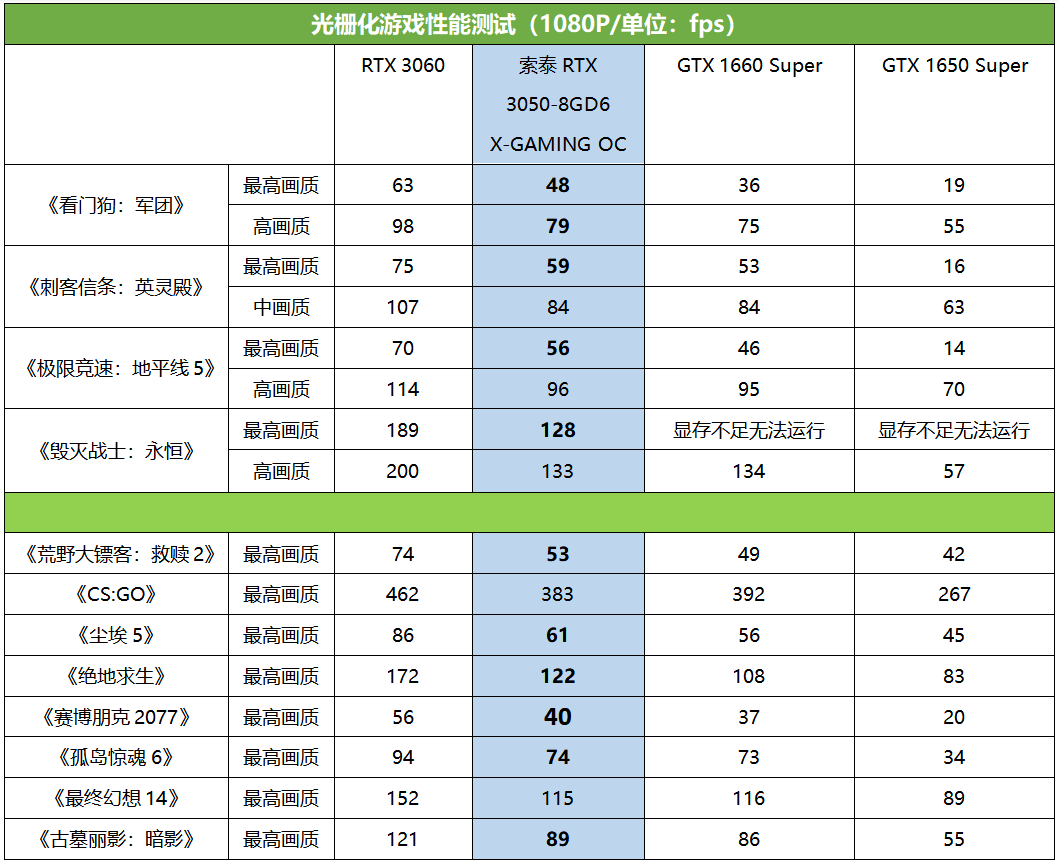 难道在游戏中的实际表现,索泰RTX 3050-8GD6 X-GAMING OC也不如GTX 1660 Super吗?