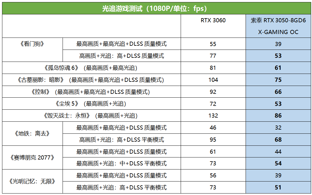 与此同时索泰RTX 3050-8GD6 X-GAMING OC还支持光线追踪和DLSS,这就对玩家的游戏体验提升很大了。在《看门狗》《古墓丽影》《控制》《地铁:离去》《赛博朋克:2077》《光明记忆:无限》等游戏中,即便是1080P+最高画质+最高光追+适当的DLSS挡位,在保证呈现出更为逼真的光影特效的同时,还有比较流畅的游戏画面。同时《孤岛惊魂6》《尘埃5》《毁灭战士:永恒》三款游戏即便不开启DLSS,也能有非常流畅的画面,整体来说索泰RTX 3050-8GD6 X-GAMING OC在光追游戏中的表现是相当不错了。