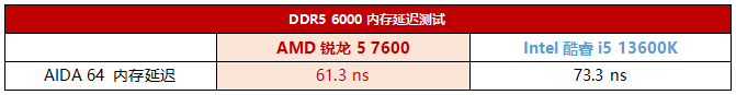 与此同时,锐龙5 7600对高频DDR5内存的支持也相当出色。我们知道DDR5内存虽然频率更高,但是相对来说延迟也比较高。锐龙5 7600可以轻松支持DDR5 6000甜点频率下的1比1内存分频,而第13代酷睿默认只能选择2分频或更差的4分频。从实测来看,锐龙5 7600在搭配DDR5 6000内存的情况下可以将内存延迟轻松压制在61.3ns,而酷睿i5 13600K只能压制到73.3ns,差距非常明显。在吃内存延迟的游戏中,高内存延迟无疑会大幅影响游戏的帧率与流畅度。