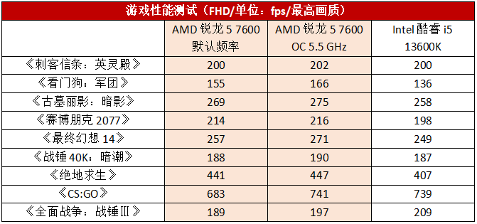 与竞品相比,锐龙5 7600在默认设置下已经相对酷睿i5 13600K有明显的优势了,测试的9款游戏中,有6款超过、1款打平酷睿i5 13600K,平均优势为领先2%。在超频到全核5.5 GHz之后,锐龙5 7600相对酷睿i5 13600K领先的幅度进一步加大,平均游戏优势领先6%。