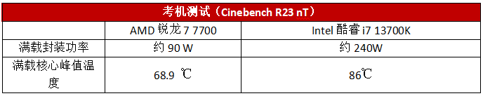 锐龙7 7700在温度和功率控制方面同样表现出色,满载核心温度也不超过70℃,满载功耗也就90W,能效方面优势明显。