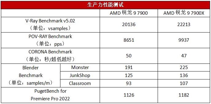 生产力性能方面,拥有8核16线程的锐龙7 7700表现同样抢眼。从测试结果可以看到,锐龙7 7700基本上保有了锐龙7 7700X大约97%的性能,不管是3D渲染输出还是视频剪辑,效率都是有保障的。