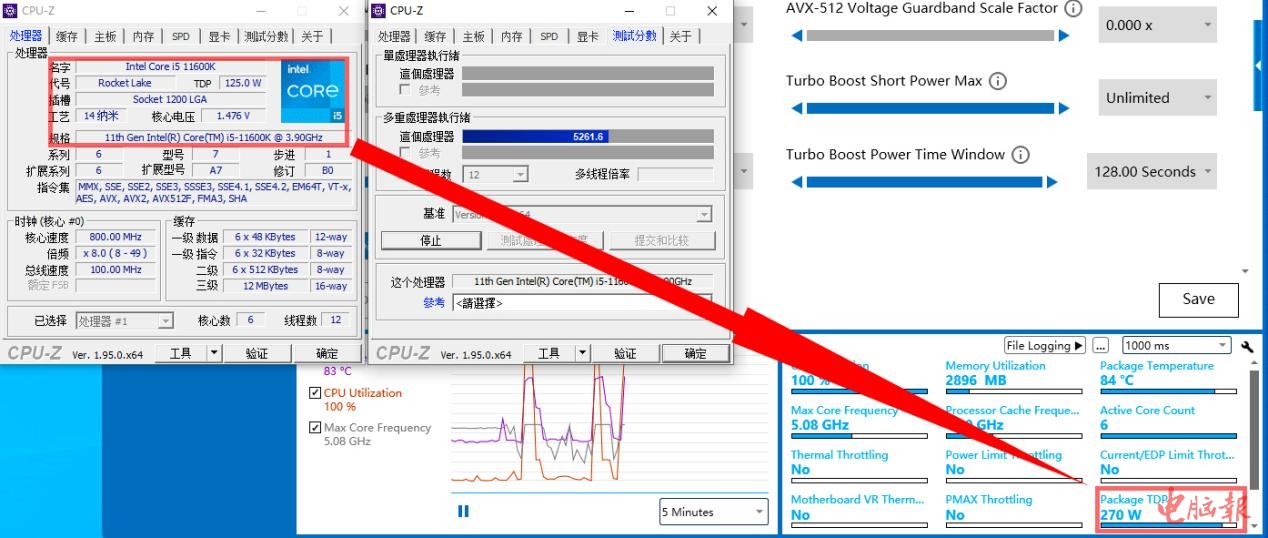 超频到全核5.1GHz的酷睿i5 11600K功率也达到了270W之高,默频使用解锁功耗墙后满载也有200W出头
