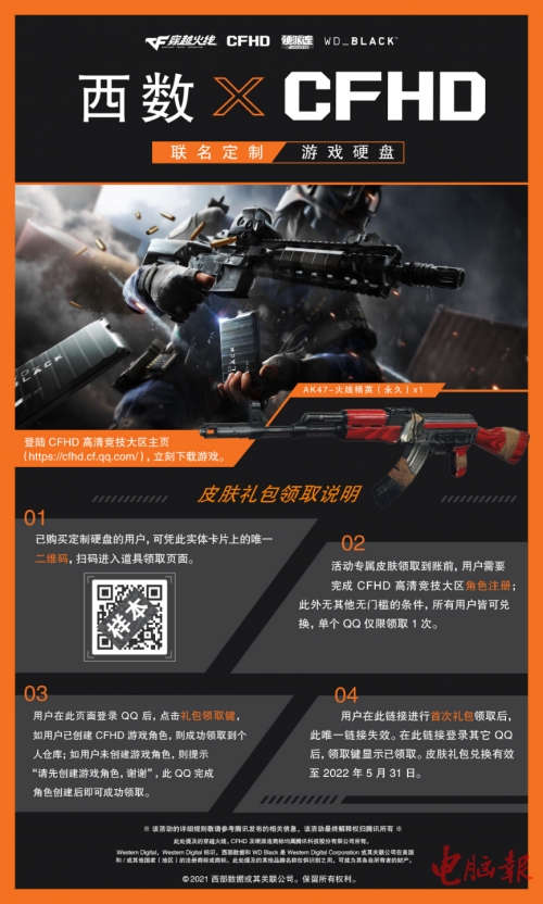 不仅如此,凡购买 WD_BLACK P10 CFHD 限量版游戏硬盘的玩家,可凭借包装内实体卡片上的链接登录 CFHD主页下载游戏。在完成游戏角色注册后,玩家可通过扫描实体卡片上的唯一二维码,兑换活动专属永久皮肤礼包——AK47-火线精英一份(单个QQ仅限领取1次,兑换有效至2022年5月31日)。