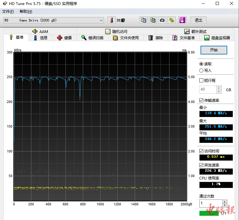 在HD Tune 软件下,WD_BLACK P10 CFHD 限量版在文件基准测试中,最高读取速度达到251.5MB/s,平均读取速度达到246.2MB/s(高出标称速度140MB/s),测试曲线相对稳定。鉴于不同平台性能不同,测试成绩可能会存在差异。