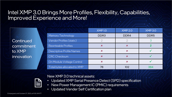 在支持DDR5内存的同时,Intel也为玩家们带来了全新的XMP3.0规范(Intel Extreme Memory Profiles)。在XMP3.0中,配置文件由之前1.0/2.0的两组增加到了五组,其中三组为出厂预设,另外两组开放给玩家自定义修改,玩法更多了。为了防止修改错乱,XMP3.0还增加了CRC错误校验。同时,配置文件的文件名也开放到了16个字符,存储空间扩大到了384byte。目前,主流的内存厂商已经完整支持了XMP3.0,其中就有今天要超频和体验的美商海盗船内存。