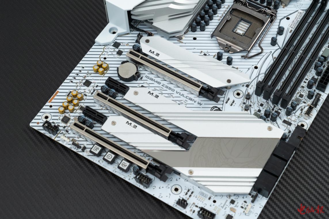 存储部分,iGame Z590 Vulcan W V20主板搭载了3条NVMe M.2插槽,主插槽支持PCIe4.0(需使用第11代酷睿i5及以上型号处理器),玩家可以使用性能更强的PCIe4.0 NVMe SSD获得更强的磁盘性能。三条插槽都覆盖有散热装甲,能够更好的避免SSD在高速读写下的过热降速问题。