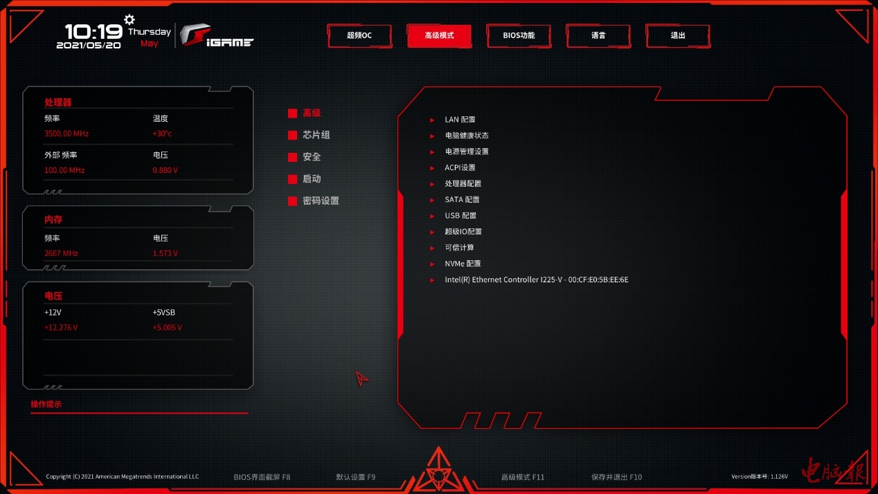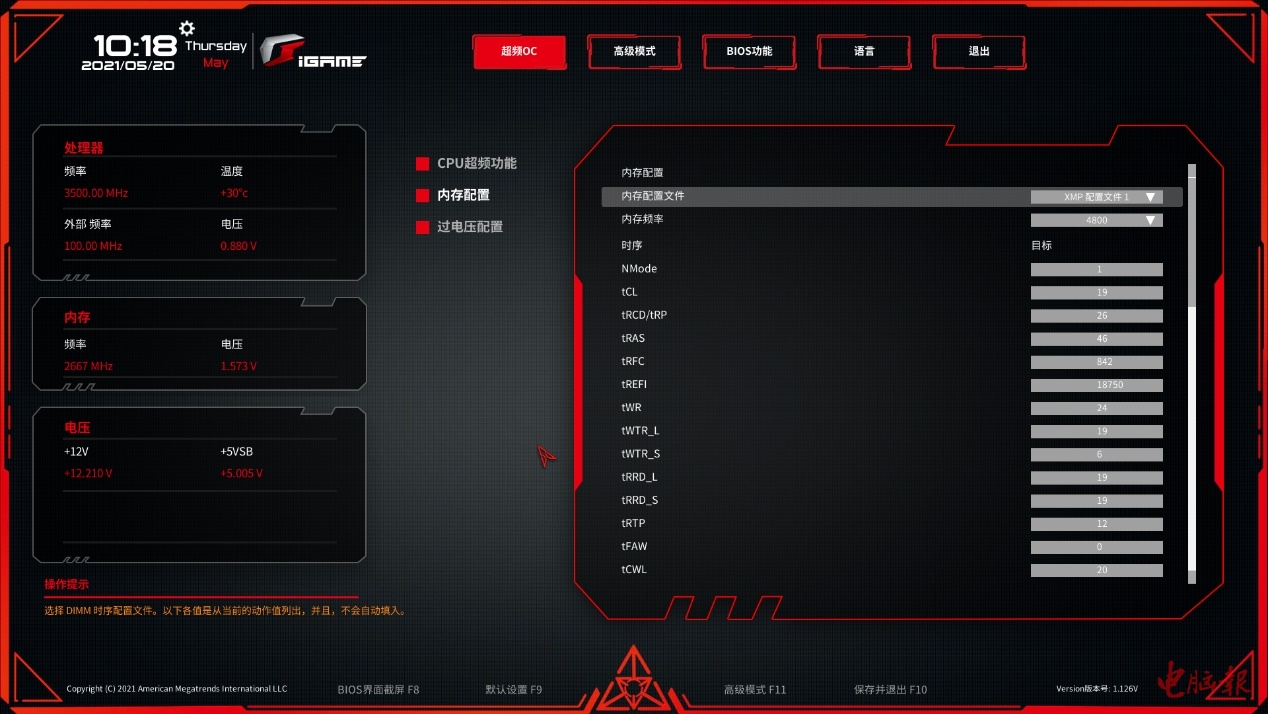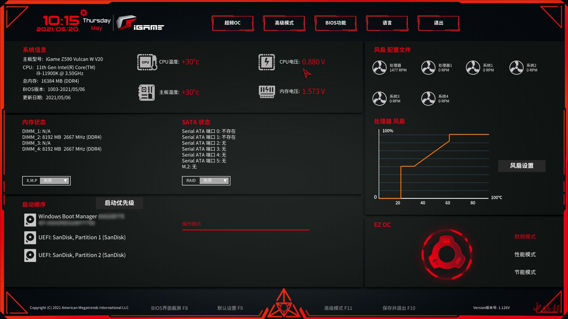 玩家们另外一个比较关心的部分就是该主板的BIOS设计。我们可以看到iGame Z590 Vulcan W V20采用了iGame新版的图形化BIOS,整体设计比较简洁易懂,操作设定比较方便,处理器和内存超频也都有单独的设置界面。