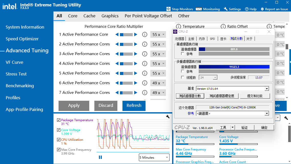 此外,我们也简单尝试了一下超频。虽然受限于常规散热器,Intel酷睿i9 12900K最终超到全核5.1 GHz就撞到了温度墙,但在尝试单核超频的时候,也比较轻松地把性能核超到了5.5GHz,CPU-Z单核分数高达881.6,可见超级雕Z690 AORUS MASTER超频稳定性还是很到位的,如果玩家手里有更强力的散热器,完全可以挖掘更多的超频潜力。