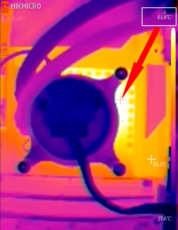 可以看到,Prime95考机时Intel酷睿i9 12900K功率大约为220W,此时超级雕Z690 AORUS MASTER的VRM MOS温度最高也没超过56℃,而海康微影P10热像仪拍摄视频中,VRM区域最高温度也没有超过61.8℃,这样的散热表现可以说是很优秀了。