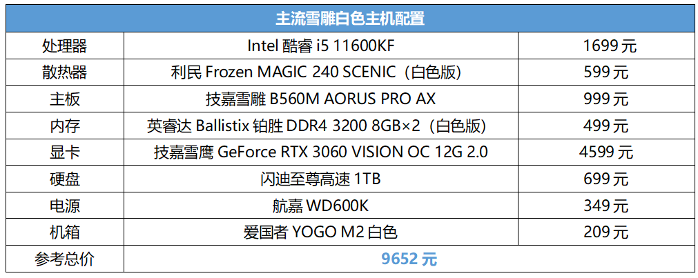 显而易见,号称B560“堆料小王子”的技嘉雪雕B560M AORUS PRO AX绝非浪得虚名,豪华的用料都堆在了刀刃上,供电和散热都达到了旗舰级水平,配合功能齐备的BIOS,有效保证了高频处理器与高频内存的性能释放,而这都是以一线厂商的研发实力为基础,开发能力弱的主板厂商是无法做到的。只有对比过,你才会发现雪雕B560M与市售丐版B560之间真的是有着云泥之别,对于希望组建一套用着稳定、省心又靠谱的主流性能级主机的朋友来讲,雪雕B560M+Intel酷睿i5 11600K/KF这套甜品组合确实值得优先考虑。这里我们也推荐了一套雪雕风格白色主机,如果喜欢的话也可以按“表”索骥一步到位。